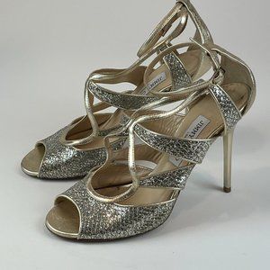 Elevate your fashion game with these stunning Jimmy Choo stiletto pumps. Crafted with high-quality leather and glitter accents, these pumps feature a peep toe design and buckle closure for a secure and comfortable fit. The ultra-high heel height adds a touch of glam and sophistication, making them perfect for weddings, parties, and formal occasions.These pumps are available in size 39 (US 9) and have a B shoe width. Pair them with your favorite dress or outfit to create an elegant and stylish look. With their strappy style and gold color, these Jimmy Choo pumps are sure to turn heads wherever you go.