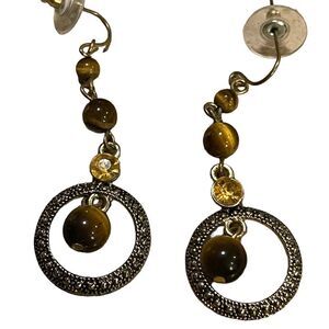 Pre loved tiger eye and marcassite like beads base metal 2” long earrings