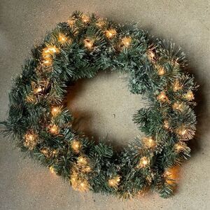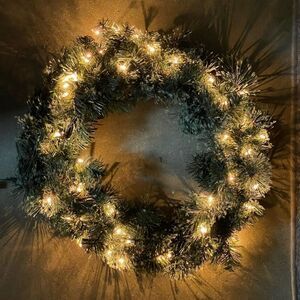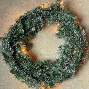 Pre-lit circular Christmas wreath for your door. Would look great if you add some decorations to it, or leave it minimalist and just leave it as it. Great condition!