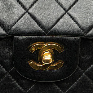 This shoulder bag features a quilted lambskin body, leather woven chain straps, double front flaps with interlocking Cs and a twist lock closure, an exterior back slip pocket, and interior zip and slip pockets. It carries a B+ condition rating.