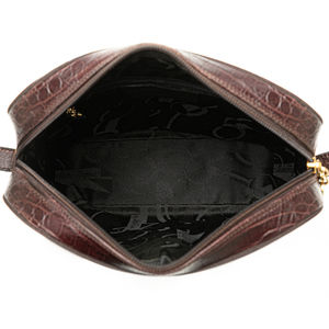 This crossbody bag features an embossed leather body, an adjustable flat leather shoulder strap, a top zip closure, an exterior front slip pocket, and an interior zip pocket. It carries a B+ condition rating.