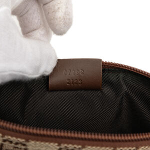 This shoulder bag features a canvas body with leather trim, a flat leather strap, and a top zip closure. It carries an AB condition rating.