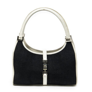 This shoulder bag features a canvas body with leather trim, a flat leather strap, a top zip closure, and an interior zip pocket. It carries a B+ condition rating.