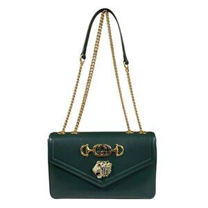The Emily features an embossed leather body, a gold-tone curb chain link strap with leather guard, a front flap with a slip-through closure and a tassel detail, and interior slip pockets. It carries an AB condition rating.