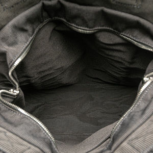 This backpack features a canvas body, a flat top handle, an adjustable flat back shoulder straps, an open top with snap button closure, exterior front slip pockets, and an interior slip pocket. It carries a B+ condition rating.