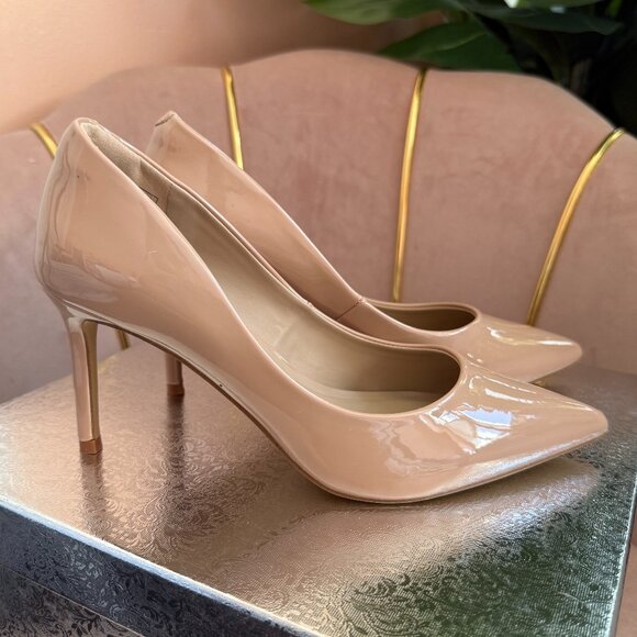 A timeless wardrobe essential, these nude patent pumps feature a sleek pointed toe and slim 3.25" stiletto heel for a polished, elongating look. Perfect for the office, formal events, or pairing with any outfit, these heels are both versatile and elegant. Gently used and in excellent condition.