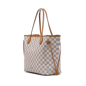 The Neverfull MM features a damier azur canvas body with vachetta leather trim, flat vachetta leather handles, an open top with a lobster clasp closure, and an interior zip pocket. It carries a B+ condition rating.