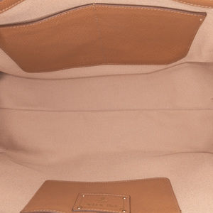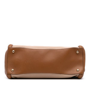 This satchel features a canvas body with a saffiano leather trim, rolled leather handles, front and back exterior slip pockets, an open top with a magnetic snap button closure, and interior zip and slip pockets. It carries a B+ condition rating.