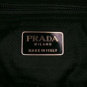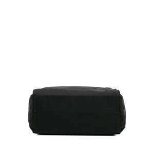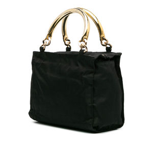 This handbag features a nylon body, a gold-tone metal top handles, a top zip closure, and an interior zip pocket. It carries a B+ condition rating.
