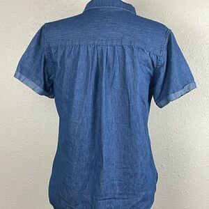 Pre-Owed Classic Mr. Wonder Womens Denim Short Sleeve Button Up Top Size S. It measures 18 inches armpit to armpit and 24 inches in length.