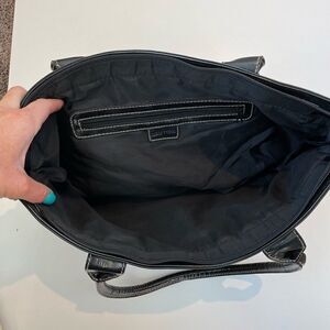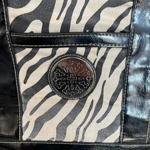 Pre-Owed super cute Treviso animal print black and white tote with white gold accents. It measures, 17 1/2 inches across, 11 1/2 inches in length, 6 inches across the bottom and the drop is 10 inches.