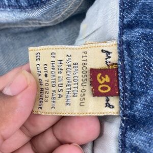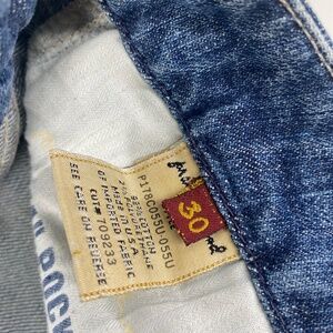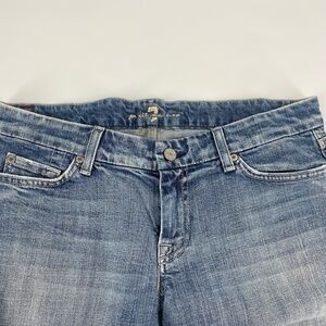 These 7 For All Mankind jeans are a stylish and iconic piece from the Y2K era (2000-2009). Featuring the signature Swarovski green crystal accents on the A-pocket, these low-rise Bermuda style jeans are in great condition, worn maybe once. With their timeless 5-pocket design, they are the perfect blend of vintage and modern style.