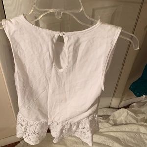 2 & 3) Pretty greenish Blue and White Tops in Size Medium. These tops are short sleeved and have lace on the front and plain in the back with buttoned keyhole closure at top. These tops are in very nice condition.