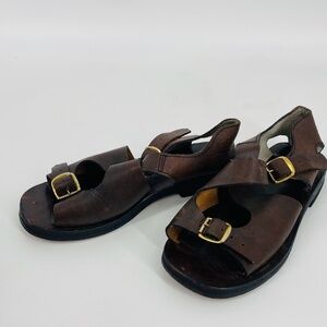 Step into unique craftsmanship with these vintage, handcrafted dark brown leather sandals made in Guatemala. Featuring a fisherman-style design with intricate crisscross straps and dual buckle closures for an adjustable fit, these sandals offer both style and comfort.