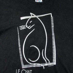 Short sleeved black t-shirt has a metallic silver outline of a sitting cat on the front with "LE CHAT" in silver metallic letters underneath.