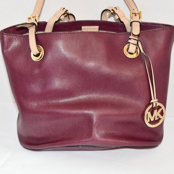 Pre-Owned Michael Kors Pebbled Leather Tote – Burgundy – Gold MK Charm – Adjusta