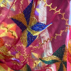 Striking upcycled embroidered textile featuring vibrant pinwheel-style stitching in blue, red, green, yellow, and gold thread on a fully transparent maroon base. Lightweight, sheer, and perfect for repurposing into garments, accessories, or home decor.