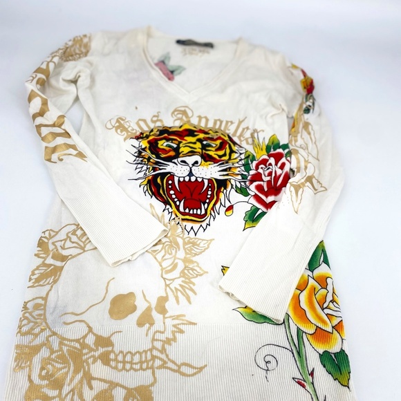 Pre-Owned Vintage Ed Hardy Tunic Sweater Y2K SizeM White/Cream 100% Cotton