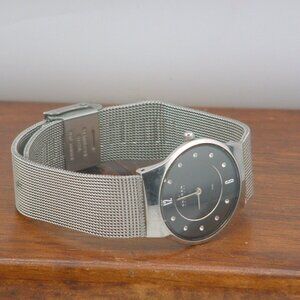 Pre-Owned Women’s Skagen 233SSSBD Jeweled Analog Dress Watch-Stainless Steel Back- Quartz Movement- Stainless Steel Band-Stainless Steel Bezel -Dress Style -Crystal -In Good Condition-Blemishes -Silver & Black Color-Works !!!