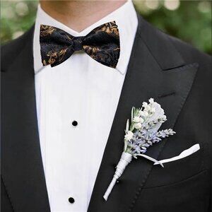 【Bow Tie Sets】1 Pre-Tied Bow Tie, 1 Matching Lapel Pin, 1 Pocket Square, 2 Cufflinks and 1 Gift Box; Men's silk jacquard bowtie, brooch, handkerchief and cuff links are all made of the same fabric to solve matching problems; Make men's simple suits or tuxedos more sophisticated