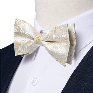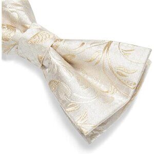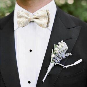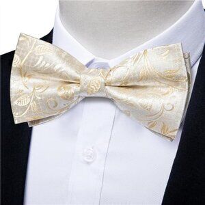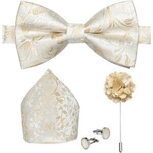 【Bow Tie Sets】1 Pre-Tied Bow Tie, 1 Matching Lapel Pin, 1 Pocket Square, 2 Cufflinks and 1 Gift Box; Men's silk jacquard bowtie, brooch, handkerchief and cuff links are all made of the same fabric to solve matching problems; Make men's simple suits or tuxedos more sophisticated