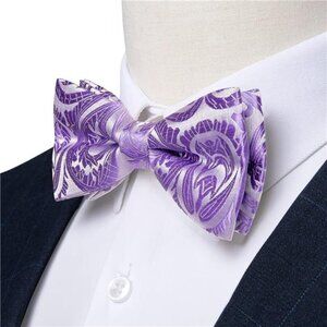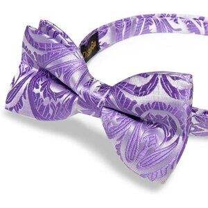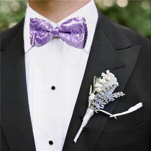 【Bow Tie Sets】1 Pre-Tied Bow Tie, 1 Matching Lapel Pin, 1 Pocket Square, 2 Cufflinks and 1 Gift Box; Men's silk jacquard bowtie, brooch, handkerchief and cuff links are all made of the same fabric to solve matching problems; Make men's simple suits or tuxedos more sophisticated