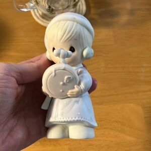 Adorable Precious Moments vintage 1988 figurine holding a clock. Features soft pastel tones.