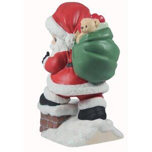 Santa Claus tiptoes across a snow-dusted roof, bag of gifts in tow, delivering joy to all. This hand-painted porcelain figurine embodies holiday magic.