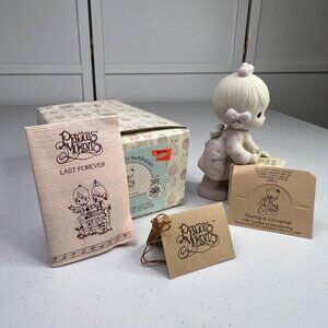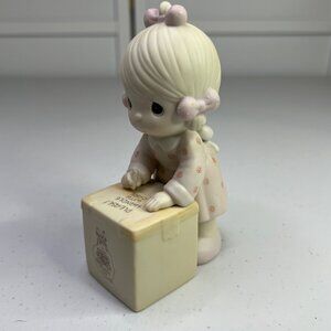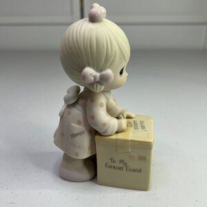 Vintage Precious Moments - Sharing is Universal collectible figurine by Enesco produced in 1987. Beautiful hand painted porcelain figurine. Featuring a girl preparing a package marked "Please! Handle with Care" and "To My Forever Friend", her pocket reads "stamps". Size: 5" x 1.75" x 3".