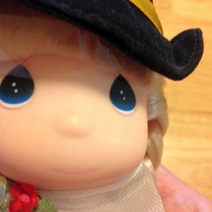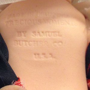 Sweet Precious Moments doll by Samuel Butcher. In very good, clean, used condition BUT PLEASE NOTE the underwear is stretched a little. Also, white may look stained in photo but is not stained. It is sheer fabric. What looks like red staining on the dress, is not visible at all when the white part is lifted. It's a very thin fabric so looks stained at top but is not. See close ups, last two pictures. Sold as collectible or for child that wants to collect Precious Moments dolls. No date I can find but probably vintage or near. Panties are a little loose.