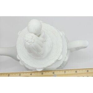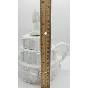 This intricately designed teapot resembles a wedding cake, complete with a bride and groom topper, and a music box in the lid! Crafted from porcelain, it has one flaw but not visible when lid is on the teapot.