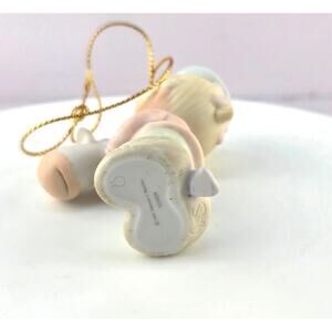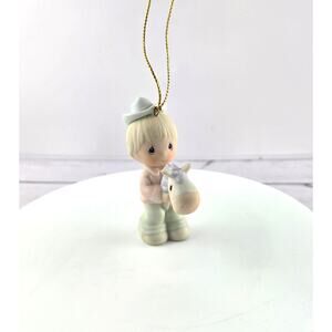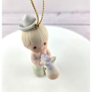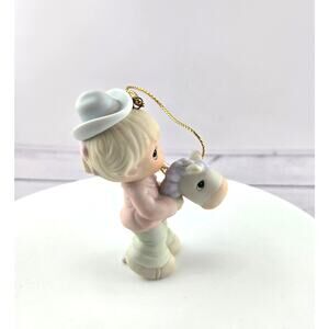 1991 Samuel J. Butcher Precious Moments Ornament. This adorable little man with his hobby horse and cowboy hate are a great addition to any tree. He is in excellent condition, no chips or cracks. #523224