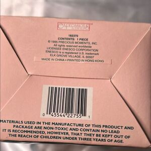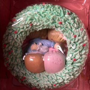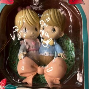 Adorable Precious Moments ornament featuring a blonde-haired duo. Accented with pink and blue details. Perfect for holiday decor.