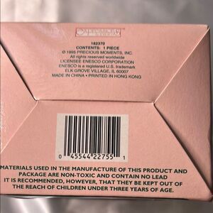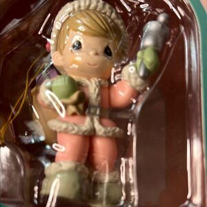 Adorable Precious Moments ornament with pink and green accents. Perfect for holiday cheer.