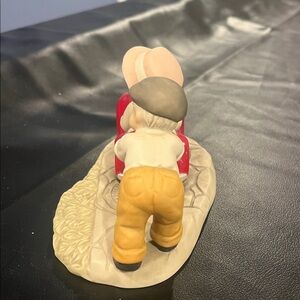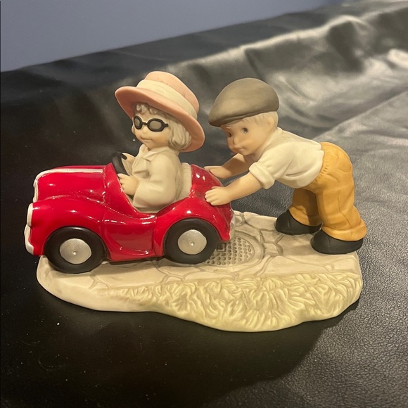 Charming figurine of a child pushing a vibrant red car. A delightful piece for any collection.