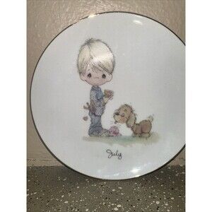 Keywords: Precious Moments, July Plate, Collectible Plate, Enesco, Boy and Dog, Birthday Gift, Decorative Plate, Vintage Plate, Home Decor, Collectible, Display Plate, Gold Trim, Keepsake, Nostalgic