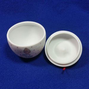 This adorable trinket box is apple shape that features a iconic Precious Moments figure holding a report card in front of a teachers desk. There are little red apples scattered throughout the apple with a red ribbon tied around the stem with the saying "Love Never Fails".