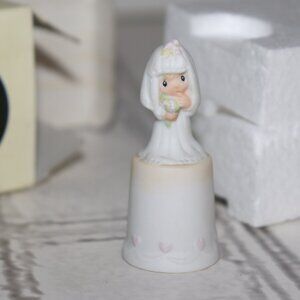 This vintage Precious Moments mini figurine features the comforting phrase “The Lord Bless You and Keep You,” rendered in soft white ceramic with signature gentle styling. Though it shows light wear from storage, it remains a heartfelt accent for prayer corners, spiritual bundles, or collector shelves.