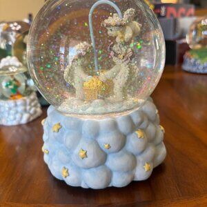 The Precious Moments Snow Globe "Catch a Falling Star" features an all-over design with a multicolor palette, depicting angels as the subject. This collectible snow globe is part of the Precious Moments collection, making it a special addition to any collection or a thoughtful gift for all occasions. The charming design and theme of angels add a touch of whimsy and nostalgia to this globe. Sitting on top of clouds, stars and rainbows the angels collect falling stars and put them in the basket.