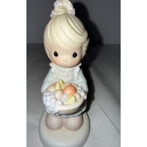 This charming Precious Moments figurine, titled "The Fruit of The Spirit is Love," is a beautiful collectible from 1993. Crafted by Enesco, it depicts a sweet child holding a basket filled with fruit and bubbles, embodying the theme of love. This piece is in excellent condition, with no visible chips, cracks, or significant imperfections, ready to add a touch of warmth and sentiment to any collection or home decor.