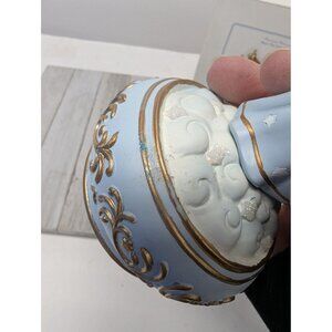 Charming angel figurine with golden trumpet and glitter accents. Blue and gold design adds elegance to holiday decor or gift collections.