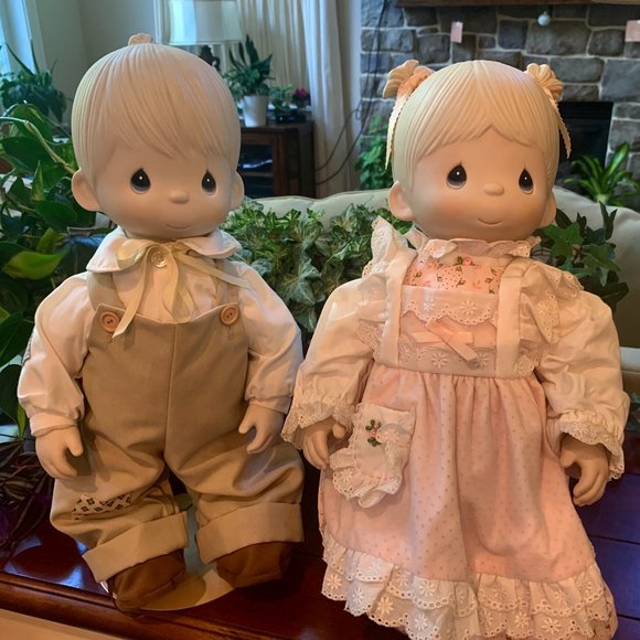 Vintage Precious Moments circa 1981 "Debbie" and " Mikey" in perfect condition. E-6214 G and B. Included with doll stands in original Precious Moments box's.