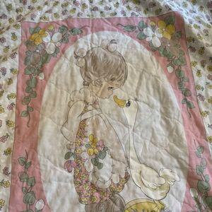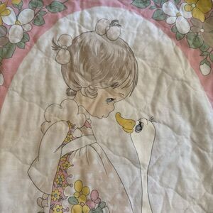 This vintage baby girl infant blanket from the Precious Moments brand features a charming design of a goose and a little girl, perfect for adding a cozy and whimsical touch to your nursery. Made of a soft cotton blend, this 42x33 quilted blanket is handmade in the United States and suitable for a crib. The multicolor design and unisex gender make it versatile for any baby girl's room, and the quilted comforter provides extra warmth and comfort. Ideal for a variety of uses, this Precious Moments blanket is a lovely addition to any baby's bedding collection.