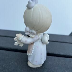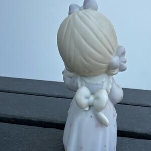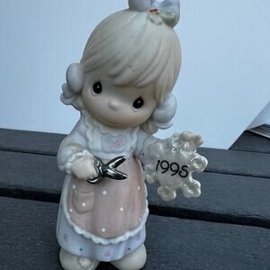 Precious moments by Enesco. Figurine holding a snowflake that has 1995 written on it and also holding a scissors. Little girl with bow on top of her head and a pink apron. One of the ties on the apron in back is broken off.. no part included. No box.