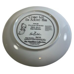 Beautiful plate showing the Nativity with Precious Moments characters. Excellent condition with no chips, cracks, crazing, etc. Beautiful shiny condition with a gold border and Sam Butcher's signature on the front lower left. About 7-1/2" in diameter. Plate does not have box or papers. The plate is much prettier in person than the pictures reflect.