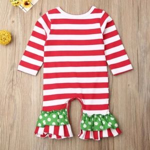 This precious red and white gingham striped long sleeved romper would look adorable on your little one at Christmas time! It fits true to size and it is a boutique item. Snaps in the legs to make diaper changes easy. It will come exactly as shown in the last picture.