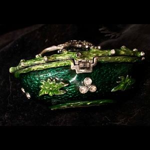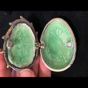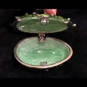 Fancy trinket holder. This adorable salamander/lizard is decorated in gems with a magnificent green shell. Opens up to egg shape (smaller in size than an egg). This will be a great addition in the home of any animal lover or pretty piece collector.