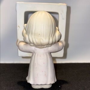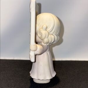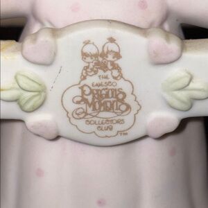 Adorable Precious Moments figurine holding a picture frame. Features delicate floral accents. Ideal for home decor.