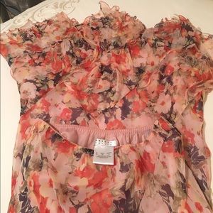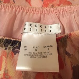 Gorgeous peach floral print, skirt and blouse set from the UK. 100% Silk and lined with polyester. Beautiful set for a wedding or romantic dinner. Its so light and delicate you won't even know you are wearing it.