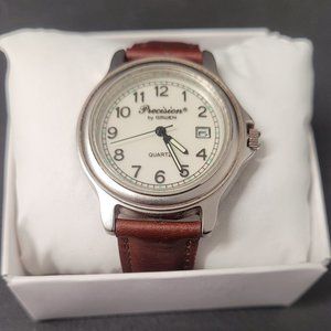 This is a Men's Precision by Gruen wristwatch. The watch has been cleaned and a new Energizer battery added. This watch has a genuine leather band and doesn't even look to be worn much if at all.